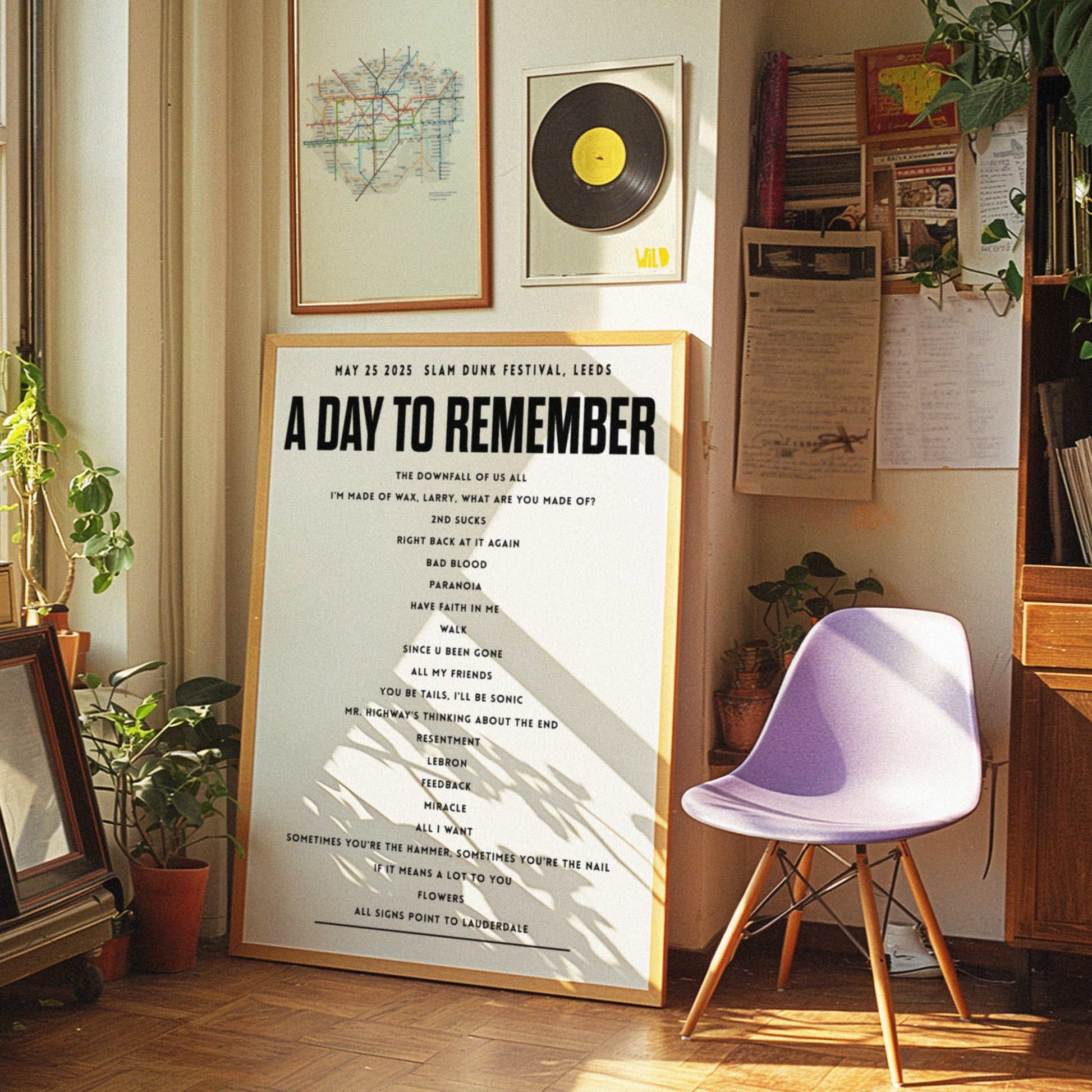 Bring your favourite concert to life! If you want a setlist poster for a specific gig, tour, or artist, we can create it just for you. Every poster is fully personalised—choose your artist, venue, date, and even select the songs that matter most.