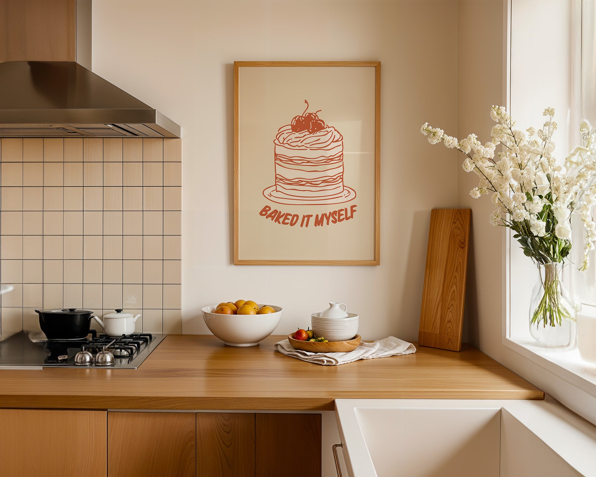 Minimalist kitchen posters showcasing coffee, wine, kitchen quotes, fruit, and culinary illustrations. Designed for effortless styling in modern spaces.