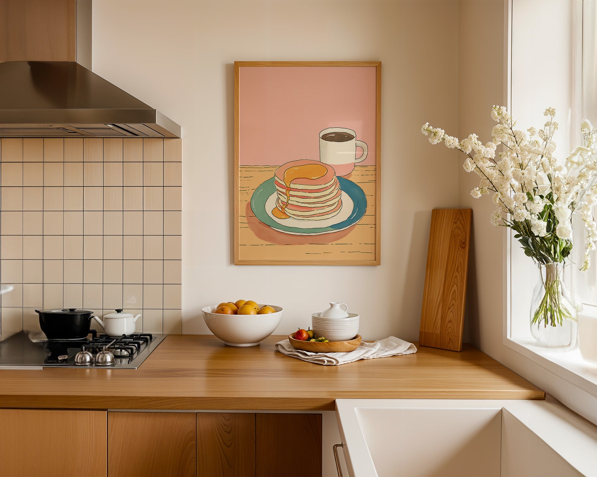 Minimalist kitchen posters showcasing coffee, wine, kitchen quotes, fruit, and culinary illustrations. Designed for effortless styling in modern spaces.